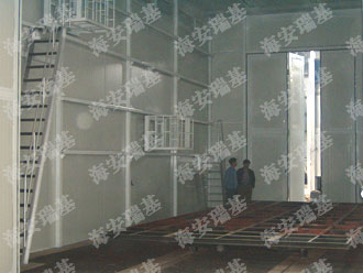干式噴漆房的室體以鋼結(jié)構(gòu)支架壁板和玻璃墻板于一體,室體前端設有工件進出通道,側(cè)面設有大型采光玻璃窗,室內(nèi)寬敞明亮。室體的上部設有被動進風過濾層,使空氣按層流狀態(tài)均勻的進入噴漆室內(nèi)。室體頂部的終效過濾層由一塊塊過濾板組合而成,在噴漆室頂部可以很方便地拆裝和清理。